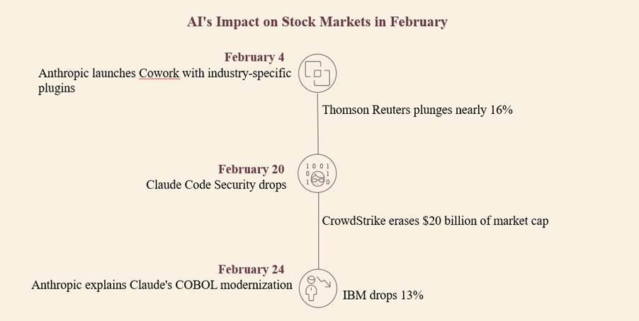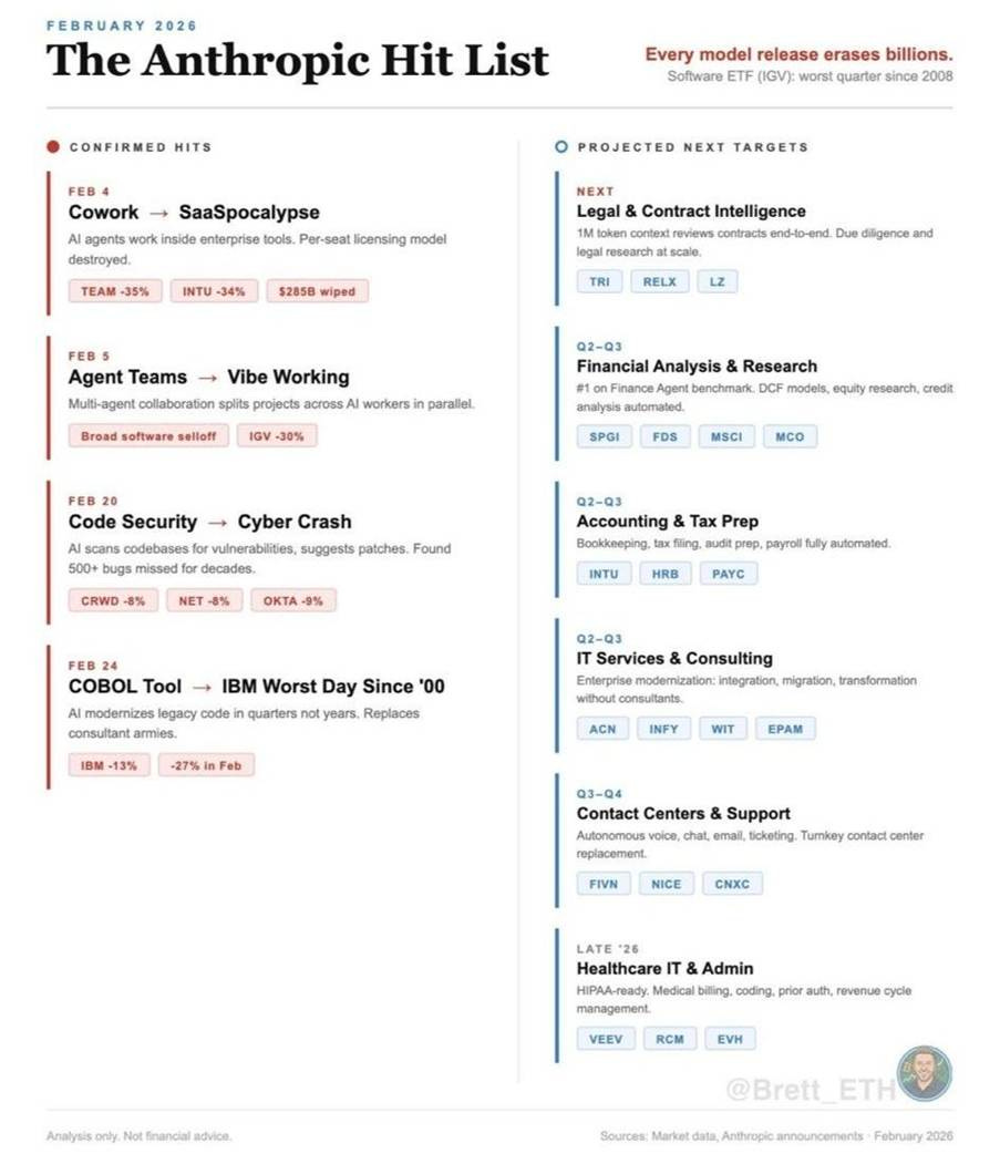 The same week Citrini published, markets were handed a live demonstration of exactly what that future might feel like. Analysts started calling it the “Anthropic Effect”: every time Anthropic releases a significant capability update, the sectors that AI could plausibly disrupt get hammered, often regardless of whether the threat is immediate or even fully real.